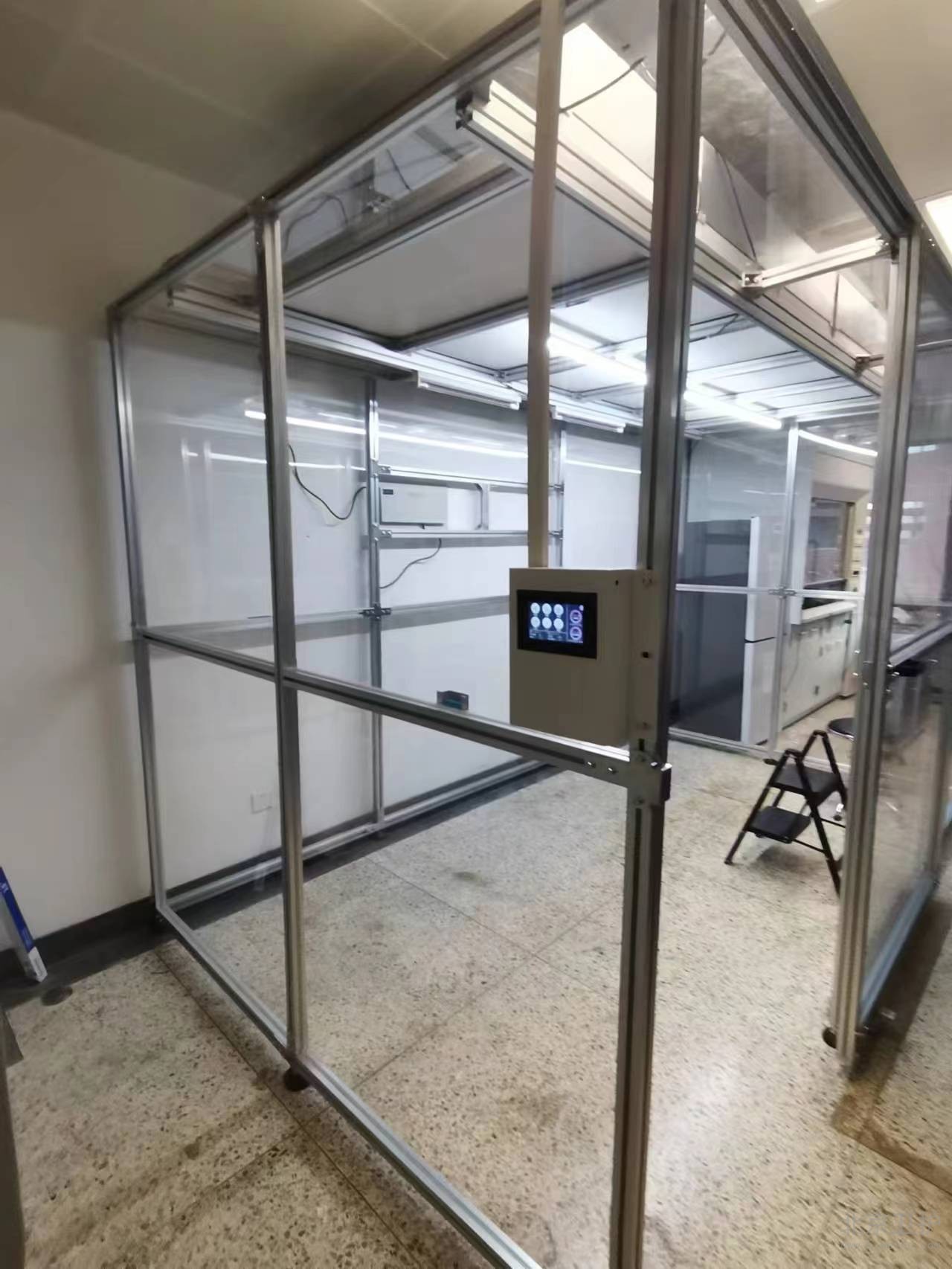 9月份我公司接到此項(xiàng)目后便抓緊時間出具相關(guān)方案、設(shè)計(jì)圖紙,經(jīng)過不斷的溝通和改動,最終確定施工方案。此單位潔凈棚設(shè)計(jì)面積20平米,主體材質(zhì)為鋁型材,隔離板使用亞格力板,頂部配有紫外線燈輔助殺菌,過濾系統(tǒng)為百級凈化模塊,并配有我公司研發(fā)的控制系統(tǒng)。從最初的方案設(shè)計(jì)、安裝施工,到最后的驗(yàn)收,總工期為10個工作日。