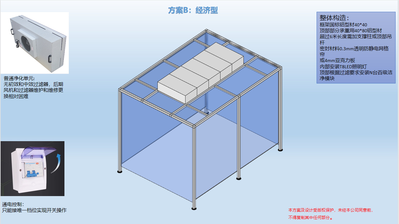 • 模塊化組裝,支持移動(可選萬向輪)、擴展或調整潔凈級別(百級至十萬級)。